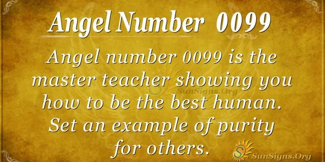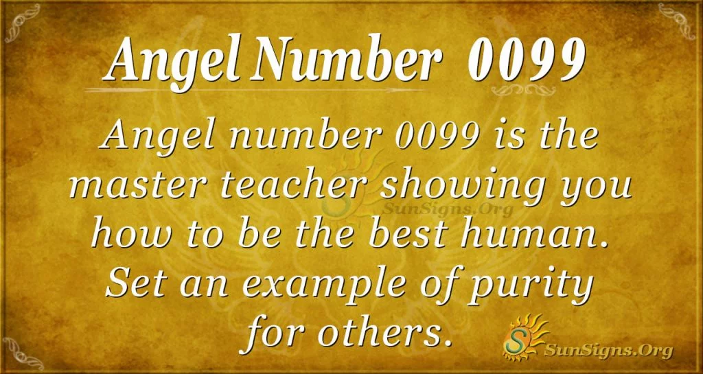 By condensing 0099 to a single digit, that is 0+0+9+9; you end up with 18. Similarly, 1+8 gives you 9. Angel number 9 is about spiritual enlightenment.