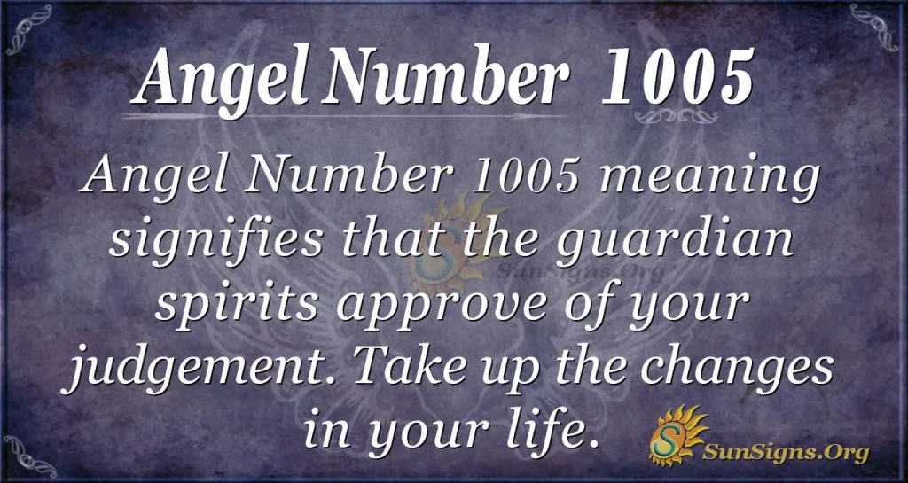 Number 1005 signifies that the guardian spirits approve of your judgment regarding the changes you are taking up in your life. They assure you that you are on the right track in your life and will help you attain your goals.