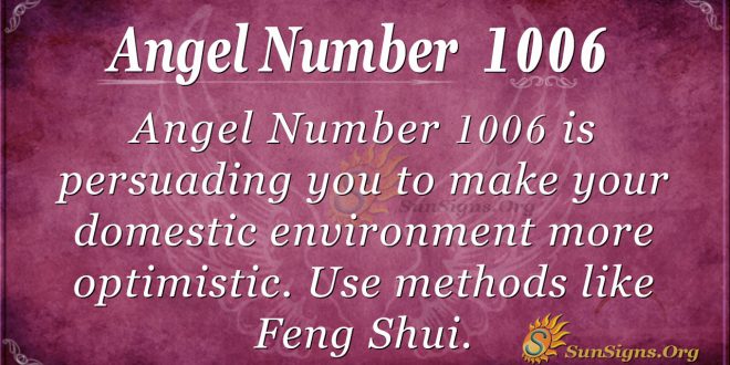 Angel Number 1006 encourages you to create a more optimistic domestic environment. Utilize Feng Shui methods and position objects in the house according to scientific principles. The angels are there to shower their blessings to help you realize your worldly requirements, provided you have a positive frame of mind.