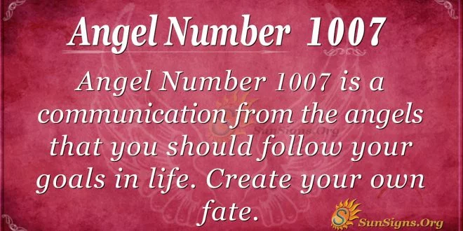 Angel Number 1007 is a message from the angels that encourages you to pursue your life goals. Create your own fate by taking guidance from the divine energies and by following your instincts. The opinions of others should not deter you from pursuing your desires.