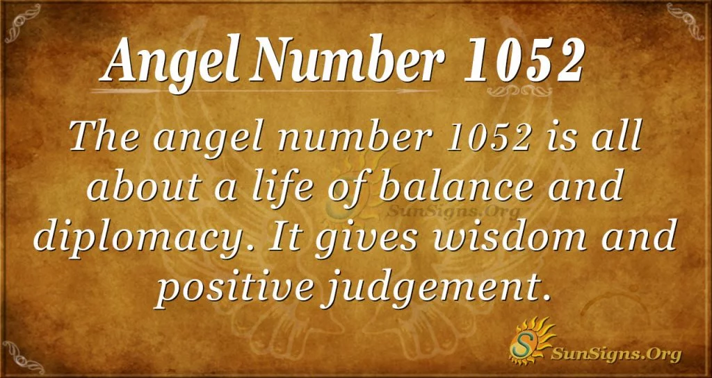 What does 1052 mean? The angel number 1052 signifies a life of diplomacy and balance. It gives wisdom and favorable judgment. The occurrence of this angel number means that you have a balanced and positive life—the angel number 1052 impacts tact and subtle skills in dealing with people. So, try to avoid or settle hostility. The angel number 1052 is all about a life of balance and diplomacy.