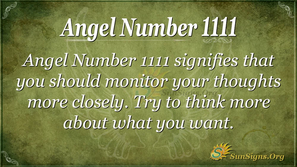 Now, what does 1 in the recurring sequence 1111 mean? In other words, What is the meaning of Angel number 1111? Angel number 1111 means that you should monitor your thoughts more carefully. The universe could be manifesting your thoughts into form. So you should try to think more about what you want and less about what you don’t.