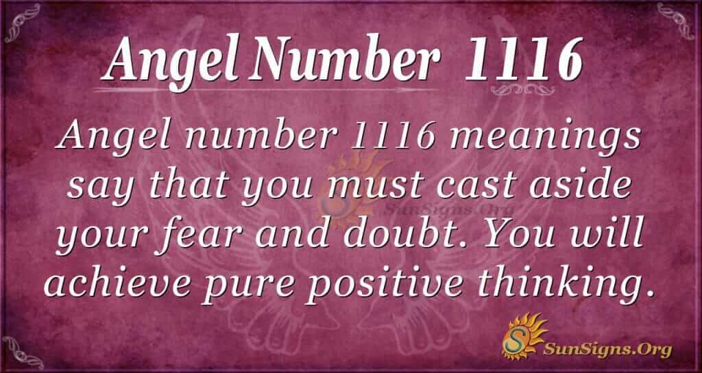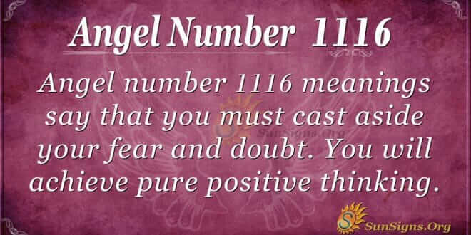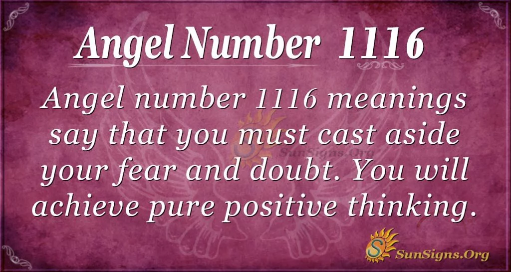 Angel number 1116 suggests that you must cast aside your fear and doubt to cultivate a positive mindset. Trust your guardian angels to help you reach those moments of inner peace when all seems lost. Trust yourself and your strength. You have a lot more than you give yourself credit for.