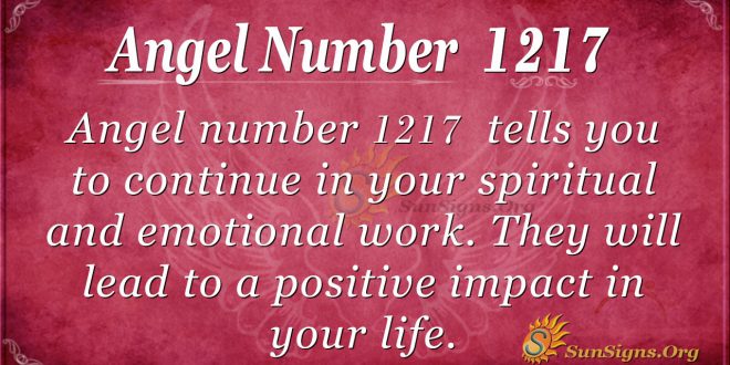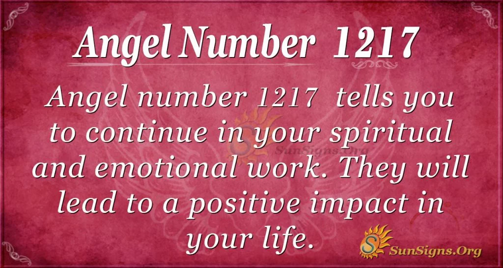 What is the meaning of 1217? The Angel number 1217 goes further to tell you to continue in your spiritual and emotional work, positively impacting your life. The angels are always available if you need to consult about your life mission and purpose. Trust is vital in getting you on your divine path.