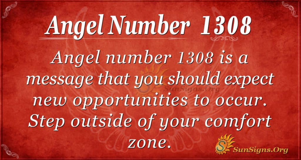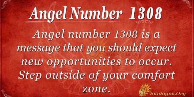 Angel number 1308 combines the energies of the numbers discussed. It also suggests listening to our inner wisdom and seeking guidance and support from the Angels. 1308 is a message that we should expect new opportunities to occur and not be afraid to step outside of our comfort zone.