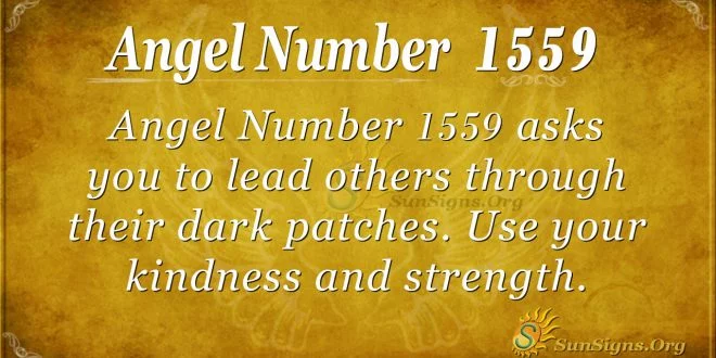 What does 1559 mean? With kindness and a reminder of your strength, Angel Number 1559 asks you to lead others through their dark patches. You have the power to bring good things to their lives as much as you do for your own. Please take advantage of that and use that as motivation to keep moving on to a future that will benefit your friends and family as much as it will for yourself.