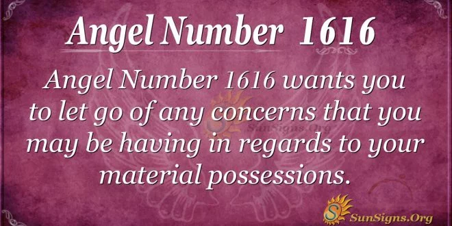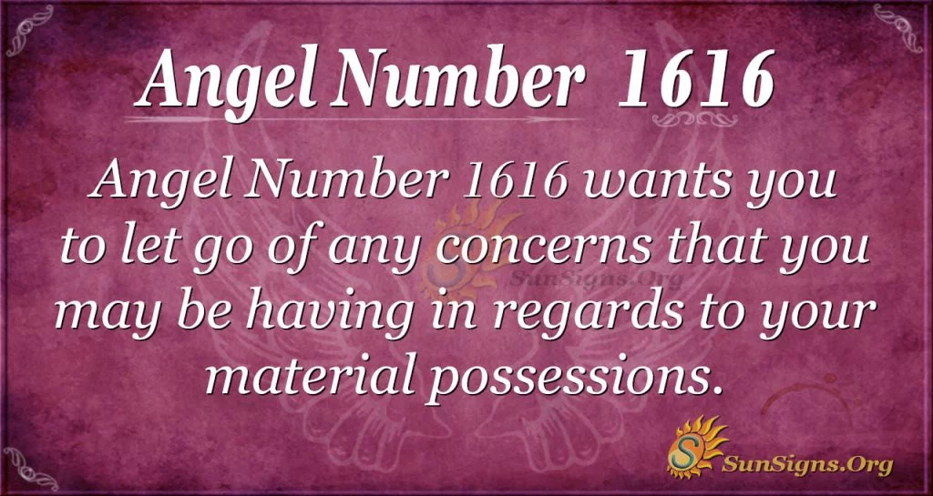 A repetitive number by nature, Angel Number 1616, wants you to let go of any concerns you may have regarding your material possessions. These should not be weighing you down for extended periods. Angel number 1616 says that you will find that you are just filled with anxiety the more you think about them.