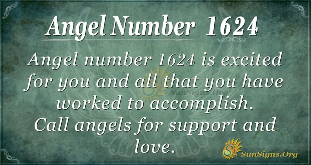 What does 1624 mean? Excited for you and all that you have worked to accomplish, Angel Number 1624 wants you to know that you have done a great job at putting your priorities into order. Remember to call on your angel numbers for support and love throughout your most demanding days.