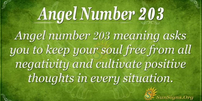 What does 203 mean spiritually? It would help to stay more positive in life and practice overcoming any negative self-talk. Accordingly, you will live a more satisfying life. Decide to live a more positive life, and your life will transform positively. For instance, when you decide to live a positive life, stress levels will be reduced, and your health will generally improve.
