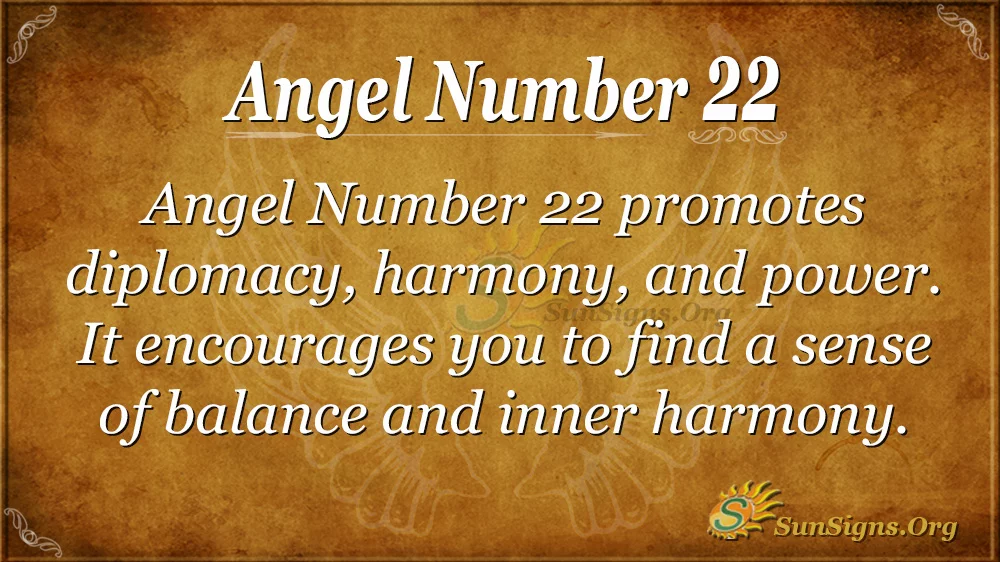 Angel Number 22 encourages you to find a sense of balance and inner harmony, helping you achieve a higher level of existence. Focusing on your personal needs can also help you gain a greater understanding of your purpose. Guardian angels use these messages to help us find fulfillment through the actualization of our dreams.