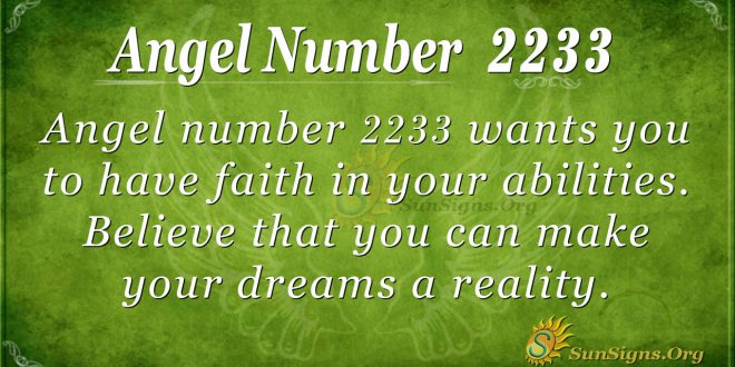 Angel Number 2233 is a reminder from your guardian angels that you need to keep your faith at all times. Believe that everything is possible if you work hard at it. This number is an assurance that the divine realm is proud of the good work that you are doing. Continue to believe that you are capable of making your dreams a reality. Use your talents and gifts to better your life and that of others. It is never too late to right all the wrong decisions and choices that you have made in life.