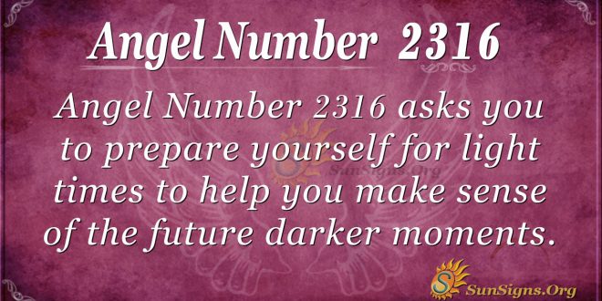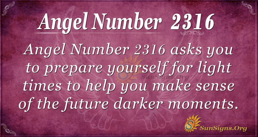 Angel Number 2316 strongly desires that you prepare yourself for light times to help you make sense of some of the darker moments that may come up at some point in your future.