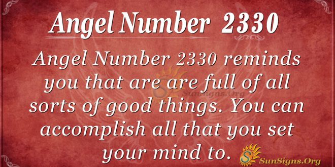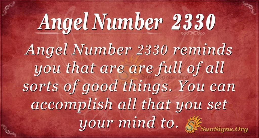 Angel Number 2330 reminds you that life is full of all sorts of good things, even when you can’t see them for yourself. It needs you to know that you are ready to take on all of the things that are out there waiting for you. All you need to do is remember that you can accomplish all that you set your mind to.