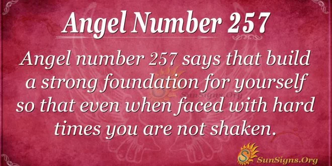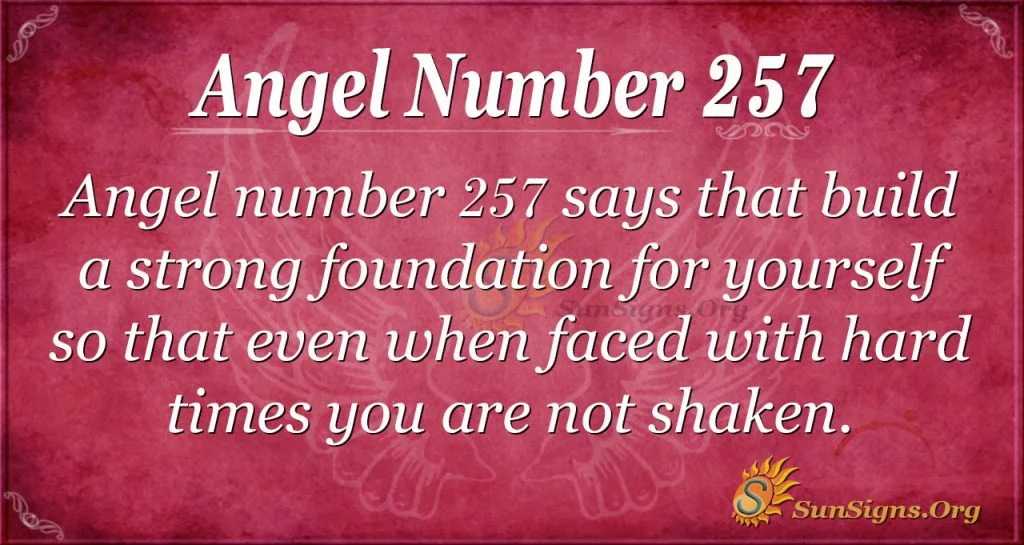Angel number 257 says to build a strong foundation for yourself so that you are not shaken even when faced with hard times. Also, when failure strikes, get up and start again. Be bold to take off on your own and discover new opportunities. The main message from your guardian angel is to be brave and take up new challenges.