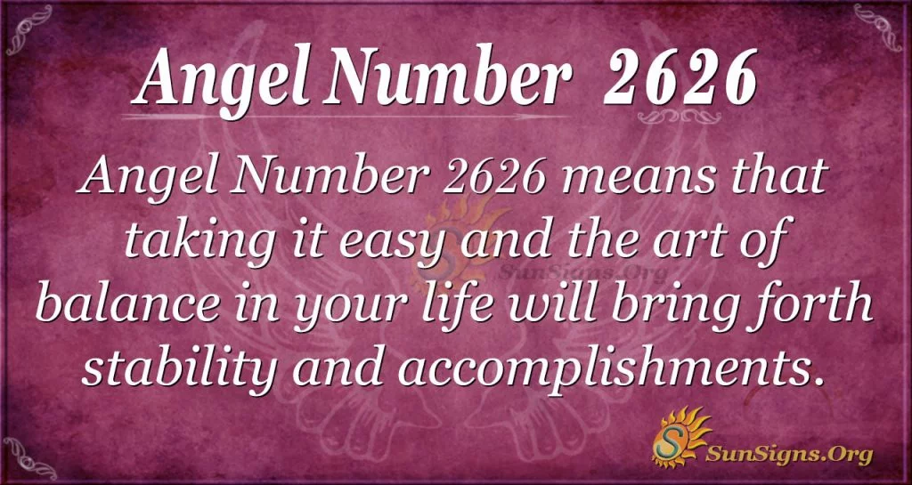 Why does the number 2626 show in your life? The number 2626 shows in your life as angel number 2626 for a reason. Seeing 2626 everywhere is an angelic sign meaning that you need to take it easy. The art of balance in your life will bring forth stability and accomplishments. In other words, 2626 represents responsibility, inner strength, modesty, and gratitude.