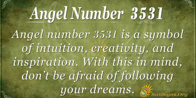 What does 3531 mean in angel numbers? 3531, meaning angel number 3531 symbolizes intuition, creativity, and inspiration. Before moving forward, decide to love what you do and thank you for what you currently have. A positive change will usher in once you master the art of living in the present.