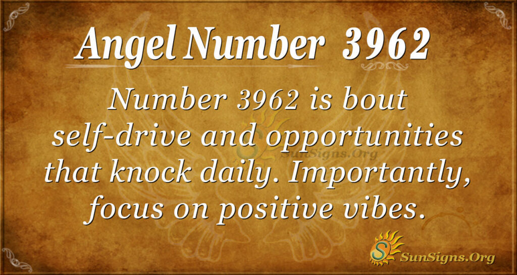 Number 3962 is about self-drive and opportunities that knock daily. Get rid of anything that derails your dreams and negative energy. Importantly, focus on positive vibes. Furthermore, do not allow stress to run over you. Mostly, listen to your inner voice.