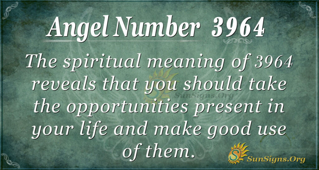 The spiritual meaning of 3964 suggests that you should seize the opportunities present in your life and make the most of them. Meet new people who will give you a new perspective on life. Your guardian angels tell you that your material needs will be provided in due time. Have faith in the universe, and the universe will not fail you.