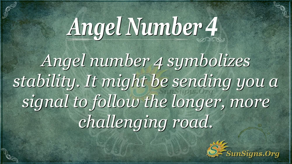 What does 4 mean in angel numbers? Perhaps it is a sign that you must take the time to develop your skills or knowledge in the workplace. Angel Number Four could tell you to take time to work on an important area in your life. For example, it could be an area where you yearn to profit. By dedicating yourself to this realm, you will set yourself up to reach your ultimate goals.