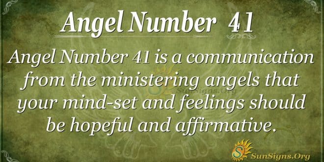 Angel Number 41 communicates with the ministering angels that your mindset and feelings should be hopeful and affirmative. Your ideas and actions are being converted into physical realities that benefit you in real life. You should work with self-belief and hope your efforts to accomplish your ambitions will yield the expected outcome.