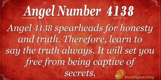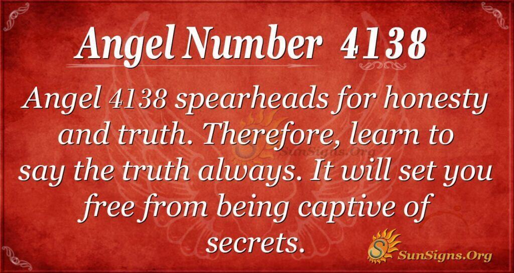 Angel 4138 spearheads for honesty and truth. Therefore, learn to tell the truth always. It will set you free from being captive of secrets.