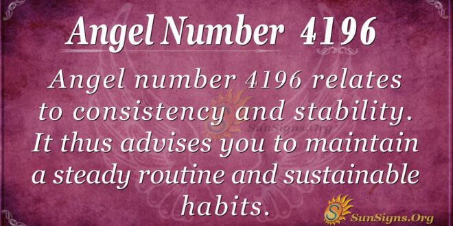 So, what does 4196 mean symbolically? Angel number 4196 symbolizes ambition, success, routine, and stability. It thus urges you to create a sustainable routine.
