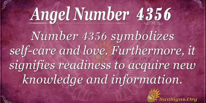 Number 4356 symbolizes self-care and love. Furthermore, it signifies readiness to acquire new knowledge and information. So, be open to corrections, especially on accuracy. Equally, love yourself first. Plus, with the best in every opportunity that presents itself. Your guardian angel will help you when in deep thinking and indecisive. But, prudently use your talents to manifest abundance.