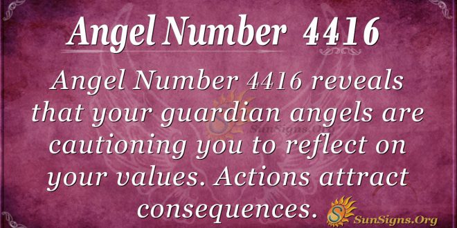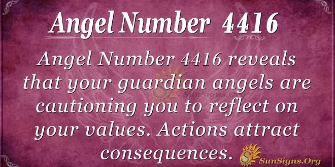 The meaning of 4416 reveals that your guardian angels are cautioning you to reflect on your values. You should seek to understand how actions attract consequences. Angel number 4416 is a message from your guardian angels that you should take responsibility for your life, thoughts, and actions.