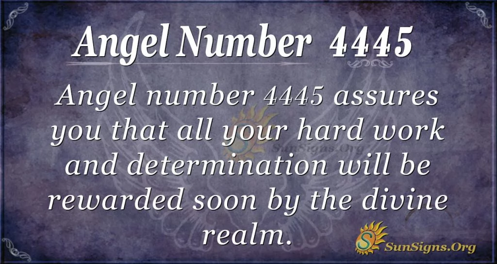 The meaning of 4445 reveals that you should keep up the good work you are doing because your guardian angels and the divine realm are cheering you on. Your guardian angels are proud of you because they know all you have done to better yourself and your life. They want to assure you that the divine realm will soon reward all your hard work and determination.