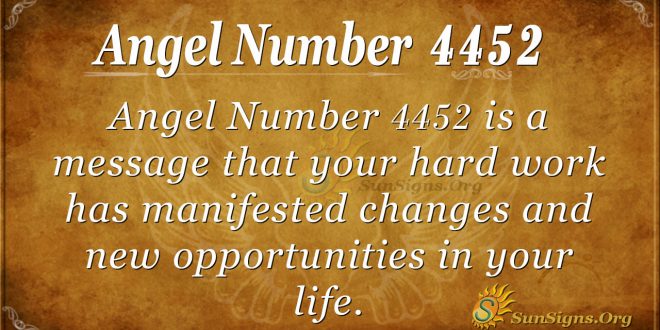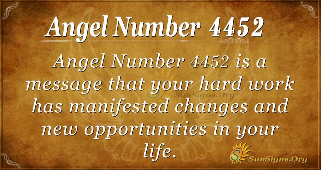 Angel Number 4452 is a message from your guardian angels that the hard work you have been doing has manifested changes and new opportunities in your life that will elevate your life. Due to your personal beliefs, you have been able to manifest success in your life. It would help if you had faith that happiness and joy are on their way.