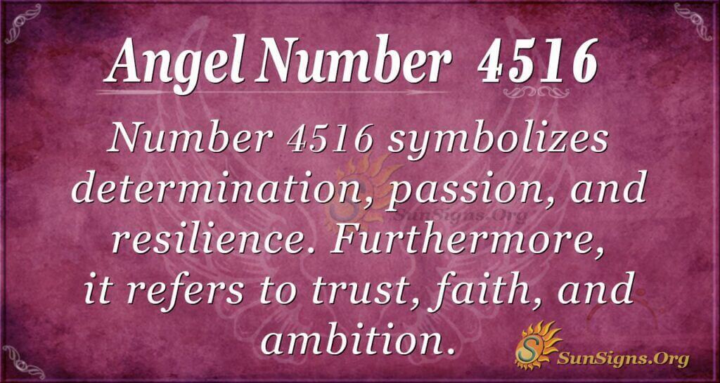 Number 4516 symbolizes determination, passion, and resilience. Furthermore, it refers to trust, faith, and ambition. Therefore, believe in your talents and skills that will catapult you to higher levels of success. Nothing should block you from finding something that your heart desires.