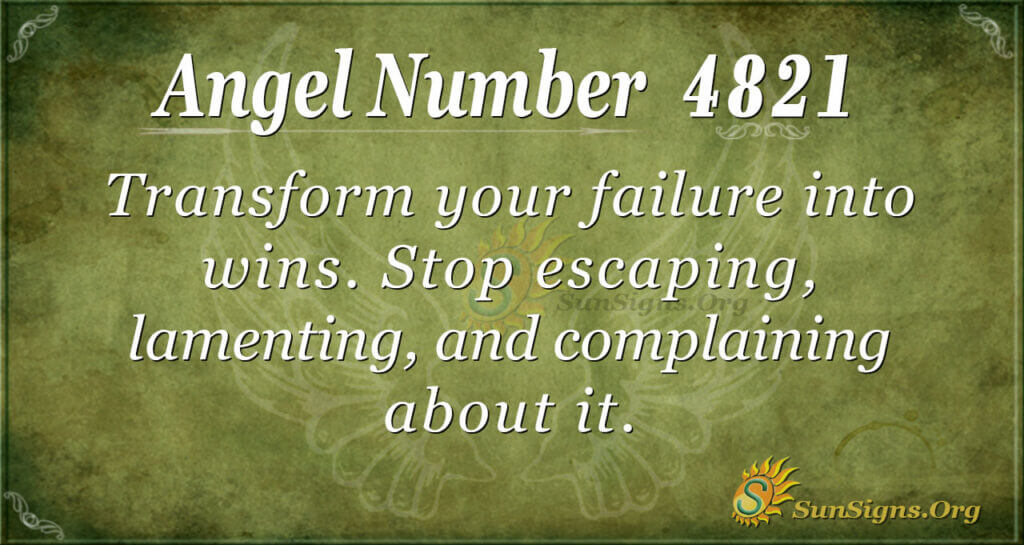 Angel number 4821 urges you to transform your failures into wins. Indeed, stop escaping, lamenting, and complaining about them. Instead, start acting by minimizing those failures as much as possible.