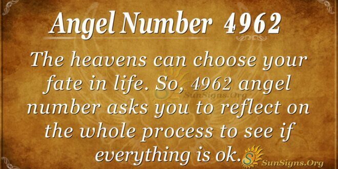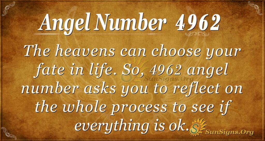 The heavens can choose your fate in life. So, 4962 angel number asks you to reflect on the whole process to see if everything is ok. It will increase your chance of succeeding. Hence, be of help to someone through motivation.