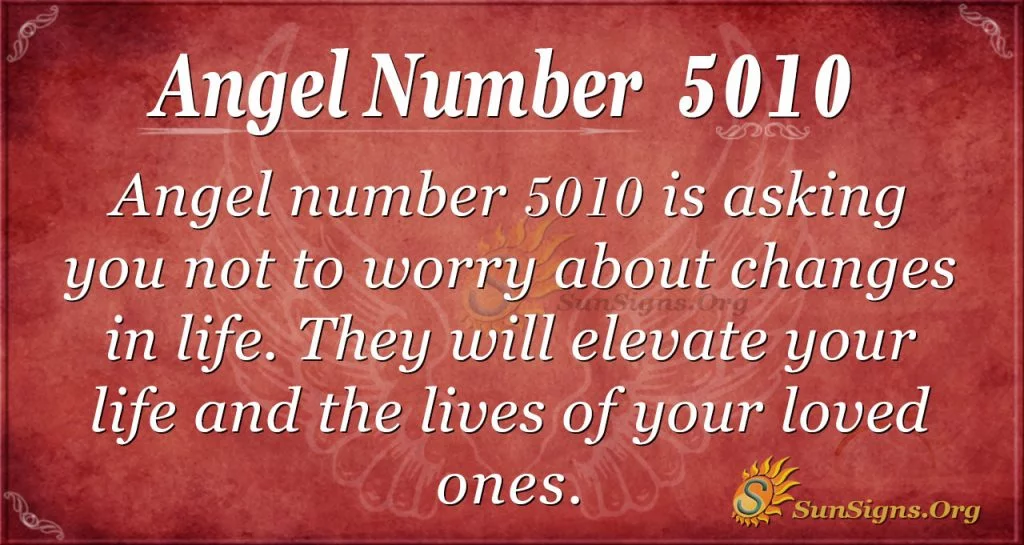 Angel Number 5010 combines the energies and vibrations of the numbers 5, 0, and 1. Number 5 is a sign that you should welcome and embrace the changes about to take place in your life.