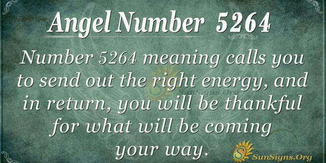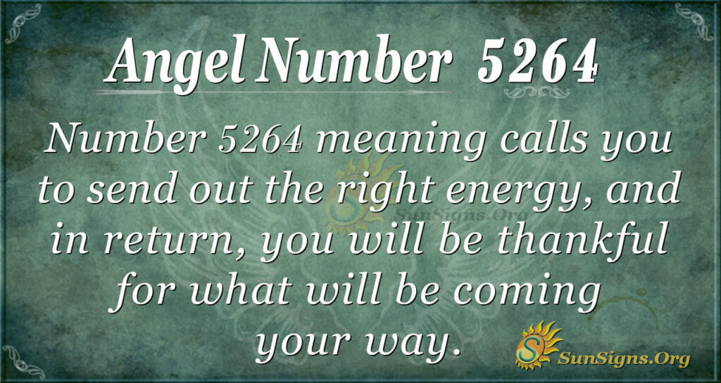 What is significant about 5264? The significance of 5264 in angel number 5264 gives you the ability to enjoy the present time. Angels want you to make peace with your reality. Make a habit of giving thanks for everything that comes your way. Number 5264 meaning calls you to send out the right energy, and in return, you will be thankful for what will be coming your way.