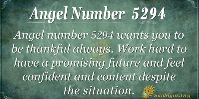 What is significant about 5294? The significance of 5294 in angel number 5294 reminds you of the power you hold within you. Angel 5294, meaning wants you to complain less and be thankful always. Work extra hard to have a promising future and still feel confident and content despite the situation. It is time to embrace peace and harmony and live in the moment.