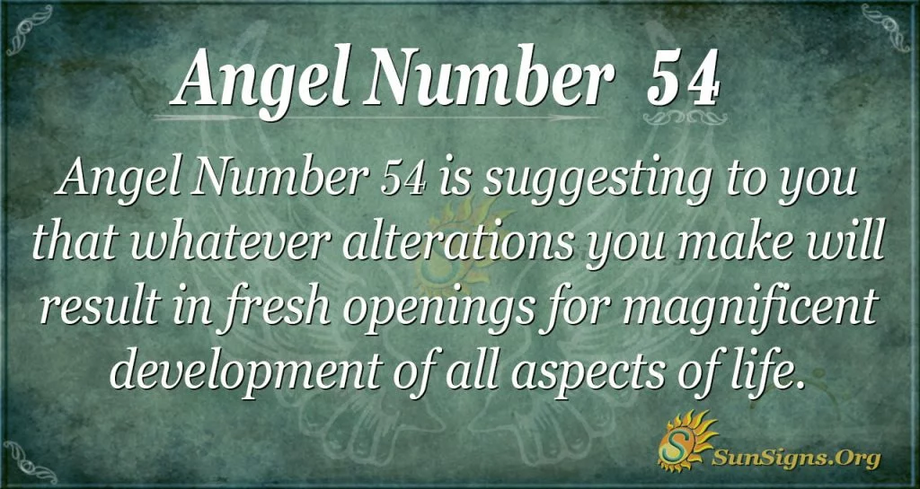 Angel Number 54 communicates that your devotion and diligence towards realizing your desires and ambitions and your optimistic assertions and hopes will provide you with favorable prospects and incentives. These openings will bring major transformations in your life, and your life will improve in all respects.