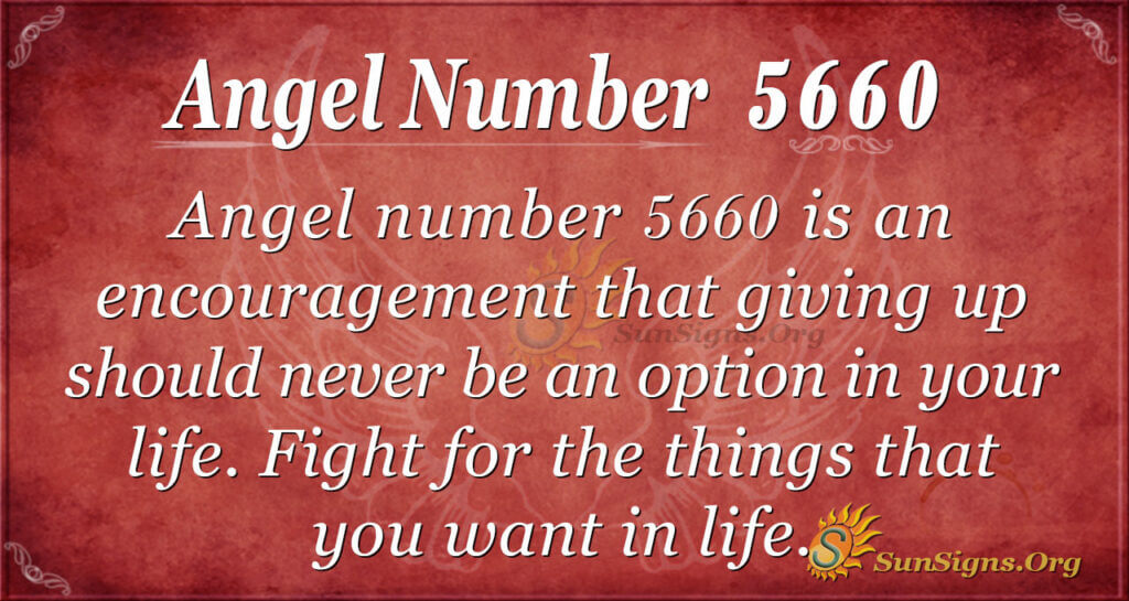 The meaning of 5660 suggests that you should resolve the problems in your relationship before giving up. Do not give up on the person you love too quickly, because things can work out for the better. You should do everything possible to keep, celebrate, and save love. Your guardian angels tell you to do everything possible to keep love alive.