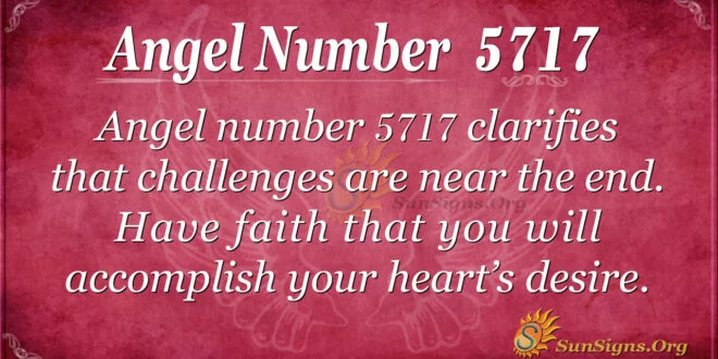 Do you still see 5717 everywhere? Thank the Celestial for seeing 5717 means that you are ready to accept the blessings coming your way. Another reason is that the Archangels encourage you to let the Universe guide you. Be prepared to embrace the unknown and take that uncertainty will never cease to materialize.