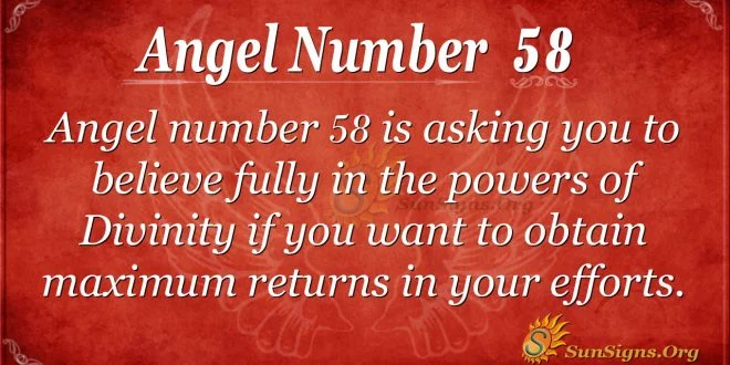 Angel number 58 asks you to believe fully in the powers of Divinity if you want to obtain maximum returns on your efforts. It is the right time to seek the grace of the angels for assistance and direction to enhance your monetary earnings and take care of your worldly requirements.
