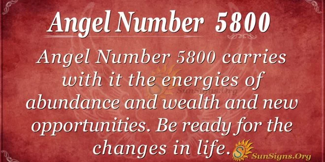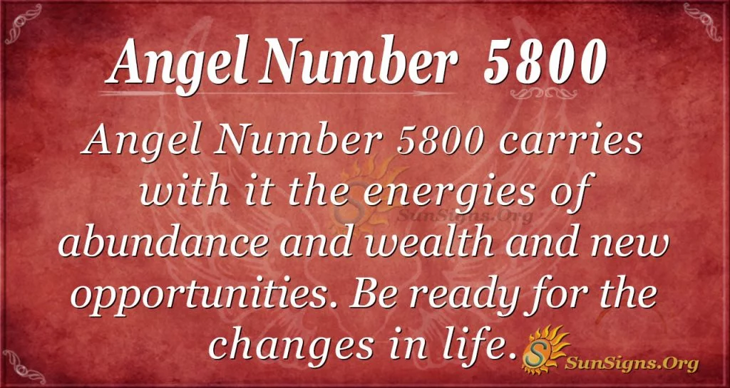 Angel Number 5800 carries with it the energies of abundance wealth and new opportunities. It is a message from your guardian angels that you should be ready for the changes that are about to take place in your life. Embrace these changes and make the best out of them.