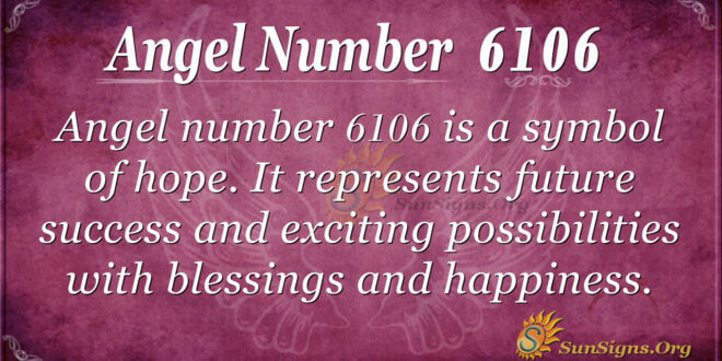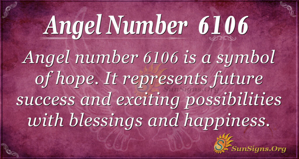 Angel number 6106 symbolizes hope. It represents future success and exciting possibilities, inviting blessings and happiness into your life. Furthermore, it encompasses all areas of life, including love, friendships, work, and spiritual wisdom. This number also reveals paths you may have missed before, opening your soul and making you more aware of your surroundings. Simply speaking, 6106 is a symbol of a new life.