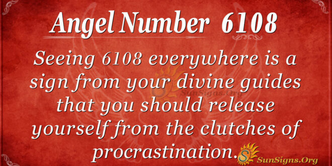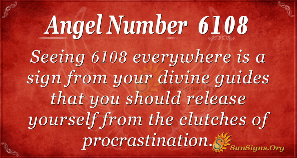 Seeing 6108 everywhere is a sign from your divine guides that you should release yourself from the clutches of procrastination. Do not allow yourself to be held back by laziness. Stand your ground and make every day of your life productive. Work hard and preserve your success so that you can enjoy it.