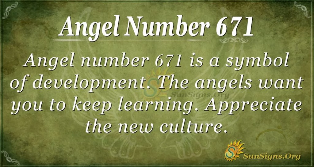 671 has a perfect symbolism in numerology. 6 is the representation of material ownership. Symbol 7 is a heavenly number. It shows the existence of a higher entity. 1 is a symbol of genesis.