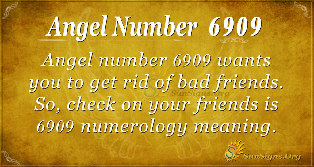 You should change some of your friends. The 6909 angel number. Indeed, some of your friendships can last a lifetime. Those people with whom you spend a lot of time now may not be close to you later on, either by choice or otherwise. It may prove difficult for you to adjust, especially if that friend is one with whom you grew up or with whom you were very close. The good news is that you will certainly learn to live without them.