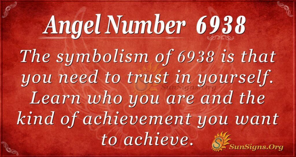 The symbolism of 6938 is that you need to trust in yourself. Learn who you are and the kind of achievement you want to achieve. Besides, seek support from heaven to help you carry out your life goals. Also, trust in your wisdom to understand the person you were born to be in the world. Lastly, just be determined.