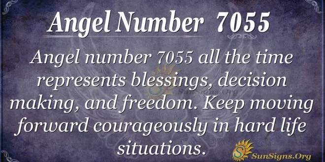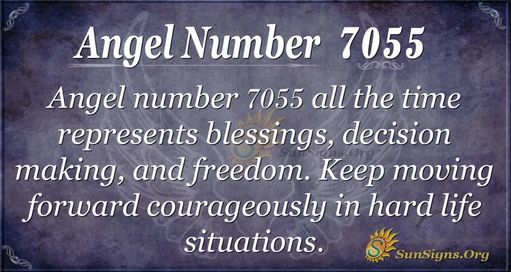 What does 7055 mean spiritually? The spiritual meaning of numerology 7055 carries the attributes of hard work, determination, and purpose. On the positive side, working whether you are paid or not increases your self-esteem and confidence. However, without a work-life balance, you lead a straining life. You are reminded to leave space for play once in a while.
