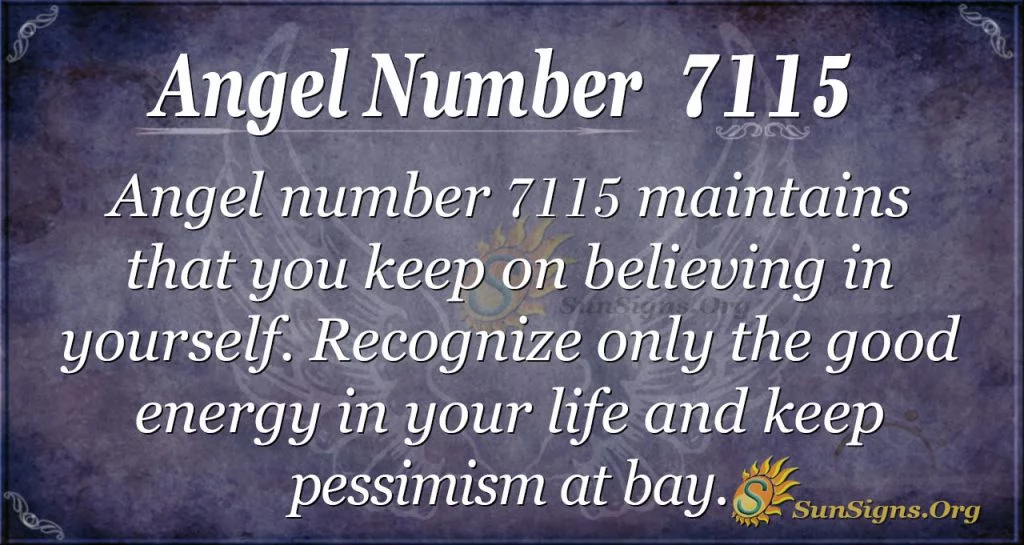 Does 7115 come up in conversation? Angel number 7115 is a message that constantly tells you that it is time to reap the benefits of your actions. The Celestial King, through angel number 7115, has a record of your good deeds. Be patient as you receive angelic blessings and recognition. Also, the repeating number 7115 meaning reminds you to find your true purpose in life before it’s too late.