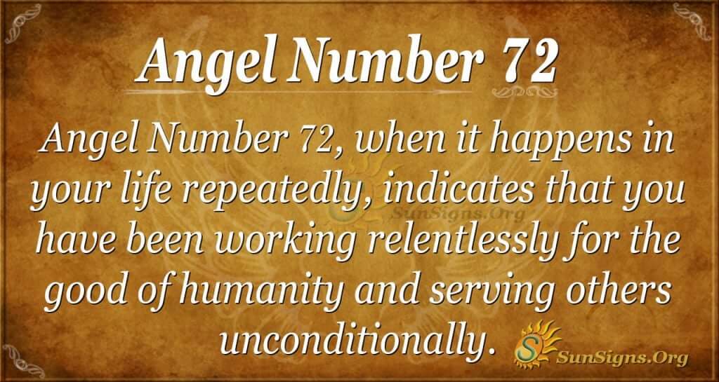 Angel Number 72, when it happens in your life repeatedly, indicates that you have been working relentlessly for the good of humanity and serving others unconditionally. Angels also appreciate your charitable work and your persistence in acting on your divine life objectives and principles of your existence.
