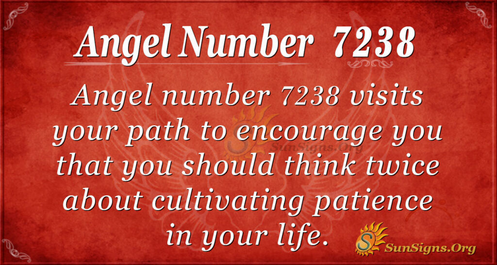 7238 spiritually indicates that you should often ask yourself why you are in a hurry. Indeed, waiting for a few minutes for something good to happen is not a bad thing. So, why are you in a hurry to get things done?